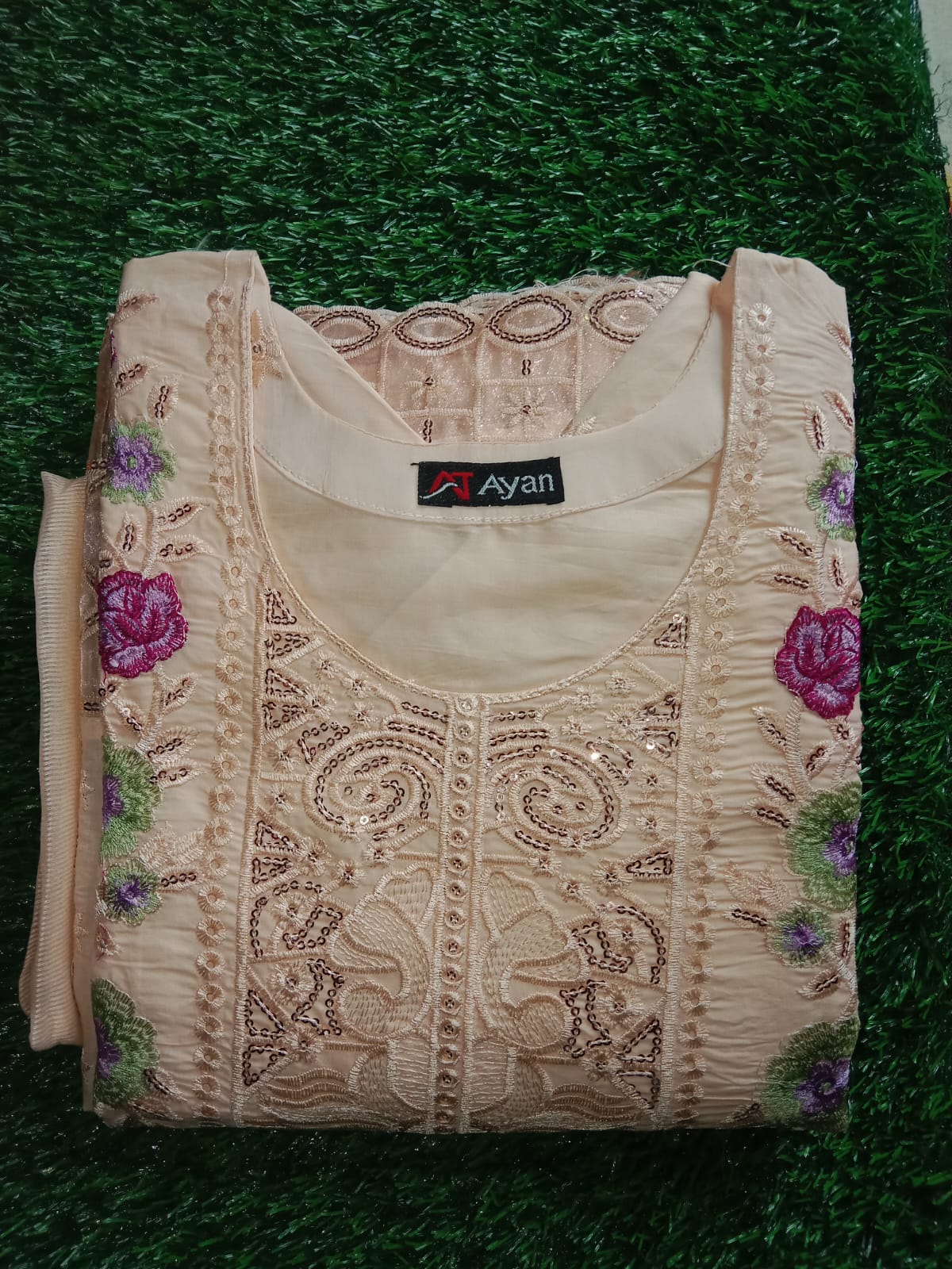 • Dupatta: A matching tonal sheer organza dupatta, lightweight and airy. It is framed by a continuous scalloped embroidered border that mirrors the kurta’s hem and is accented with decorative silk tassels at the corners.