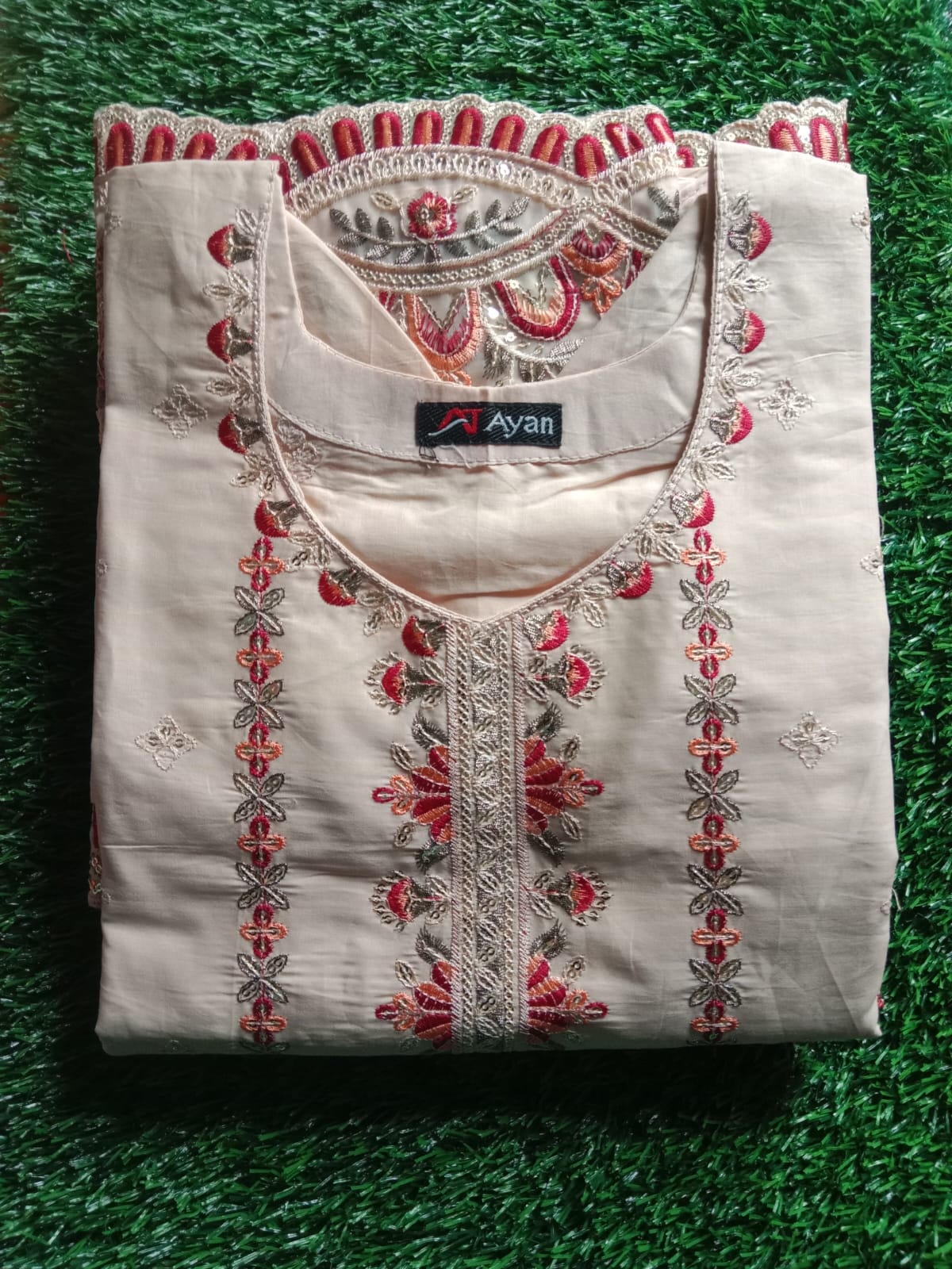 Bottom: Tailored straight-cut trousers in a matching peach shade, featuring a wide, high-density embroidered border at the ankles that mirrors the artistry of the kameez.