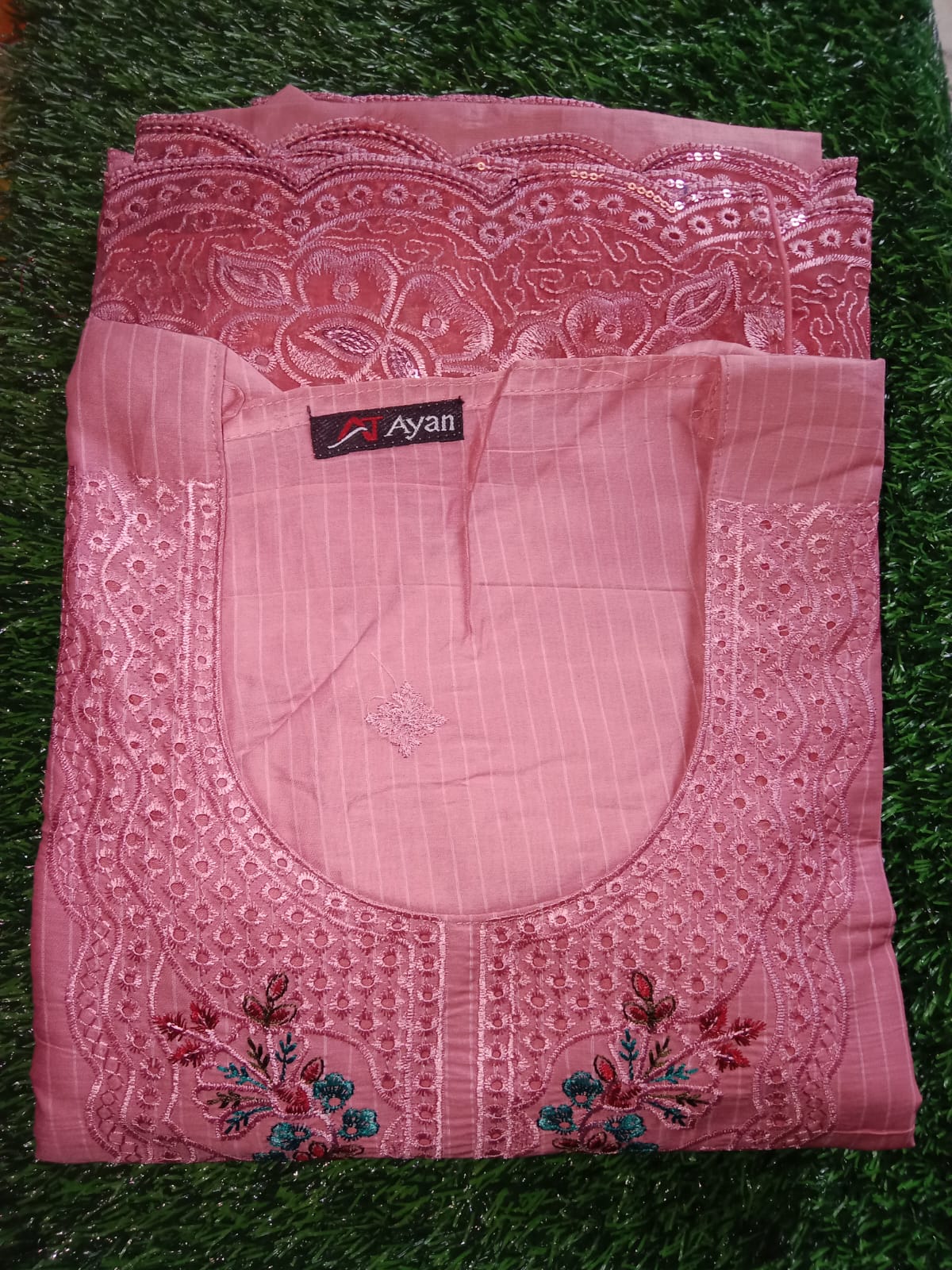 Make a statement of effortless elegance with this Serene Pastel 3-piece Cotton set. Crafted from premium A-Grade Cotton for a soft, breathable feel and a premium finish, this outfit features a stunning combination of intricate tonal embroidery and delicate floral accents. The kameez is highlighted by an intricately embroidered neckline and a unique scalloped hemline, making it a perfect choice for both festive occasions and formal gatherings.