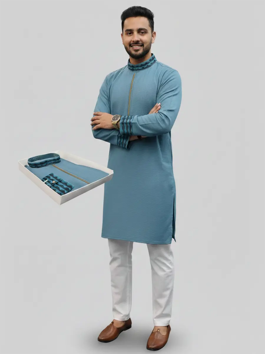 Men’s Premium Dark Sky Blue China Jafran Panjabi