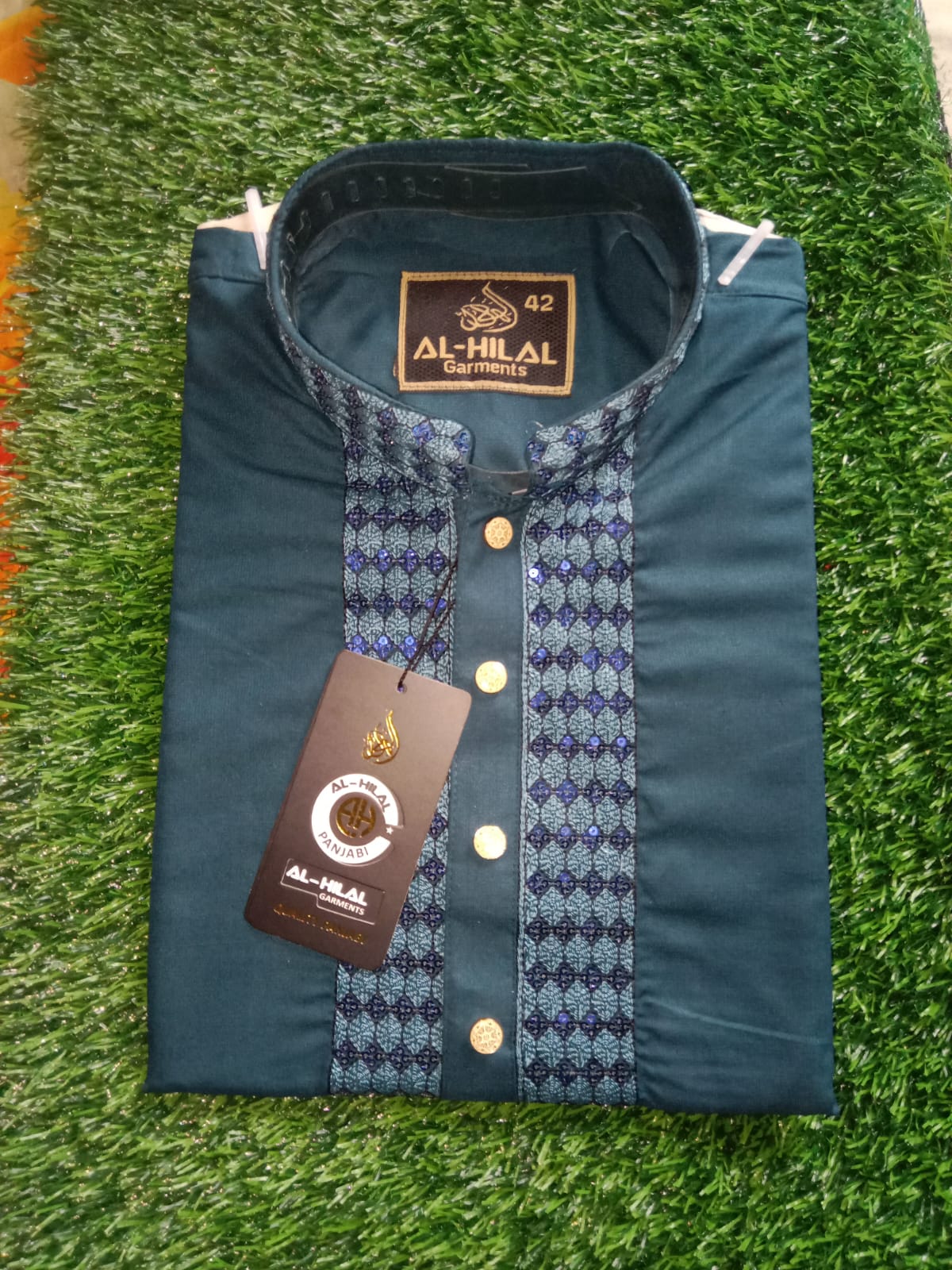 Achieve a sophisticated look with this stitched 100% pure cotton Panjabi in a deep teal blue hue. Featuring a unique geometric pattern on the placket and collar, this piece combines traditional craftsmanship with a modern, high-contrast design for a sharp and distinguished appearance.