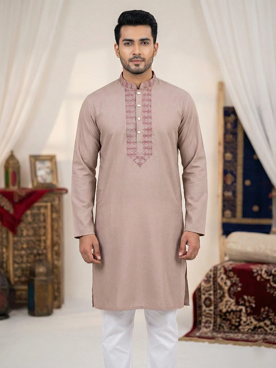 Panjabi: A long-line silhouette in a refined dusty pink (mauve) hue, featuring a smooth solid-colored body contrasted by a highly detailed, unique embroidery pattern on the chest and collar.