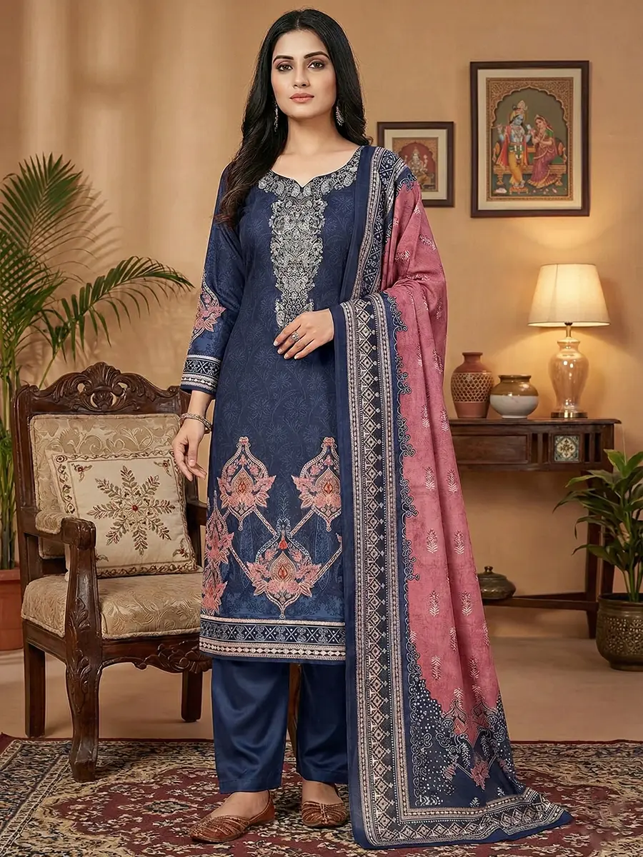Dupatta: A stunning contrast dupatta in a soft rose-pink/mauve shade, adorned with delicate traditional motifs. It is finished with wide navy blue digital-printed borders that perfectly tie back to the shirt design.