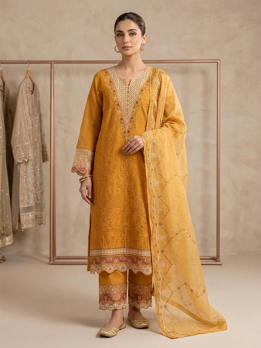 • Dupatta: A matching mustard-yellow sheer dupatta featuring a delicate, scattered diamond-pattern motif. It is framed by a fine embroidered border that ensures a graceful and airy drape.